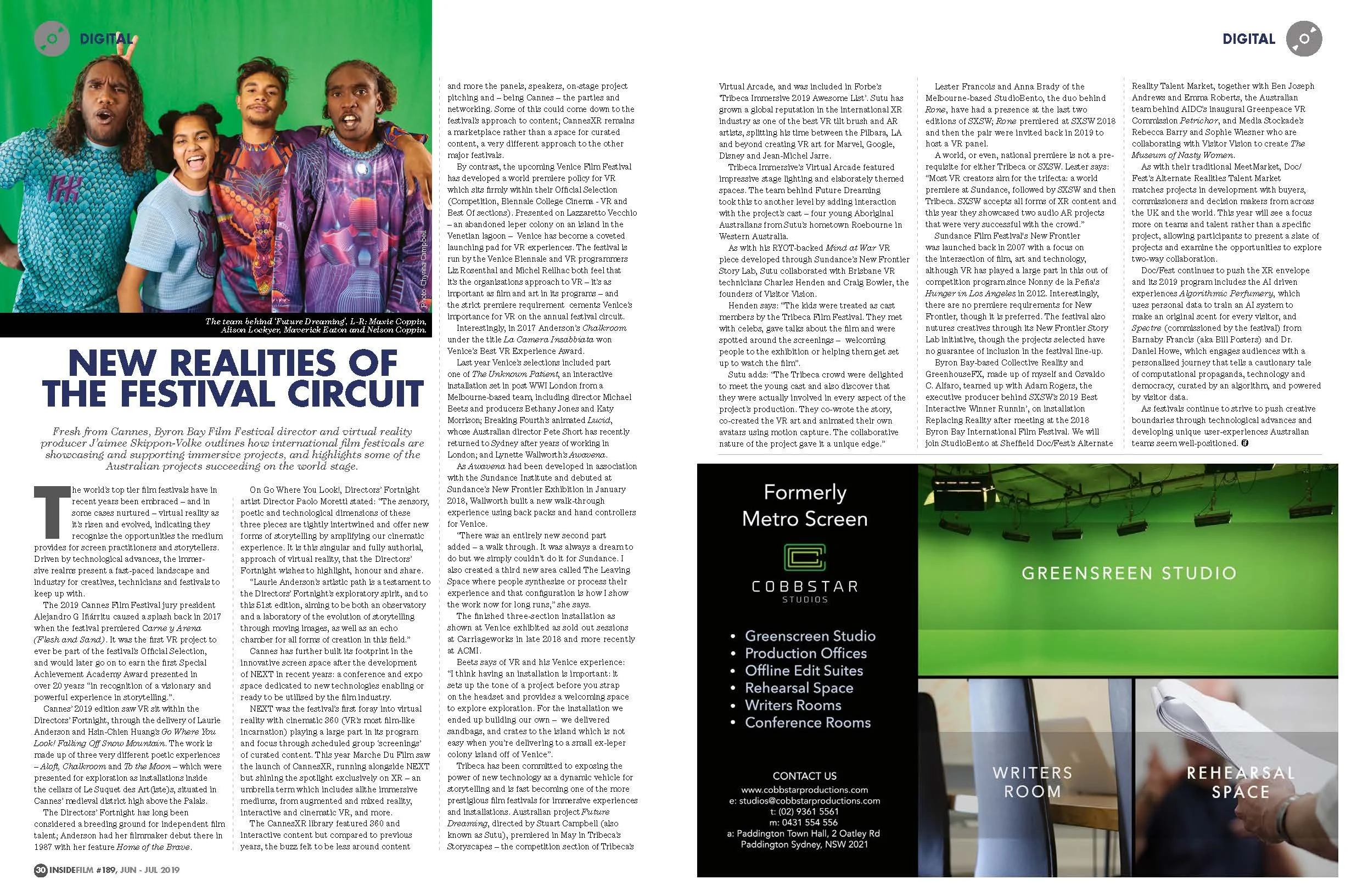 The Following is the 1st in a 3 part series of articles for Inside Film Magazine. Published in the June/July edition this piece looks at the state of play with regards to how film festivals are presenting VR - and which Australian's are making a splash.Fresh from Cannes, Byron Bay Film Festival director and virtual reality producer J’aimee Skippon-Volke outlines how international film festivals are showcasing and supporting immersive projects, and highlights some of the Australian projects succeeding on the world stage.